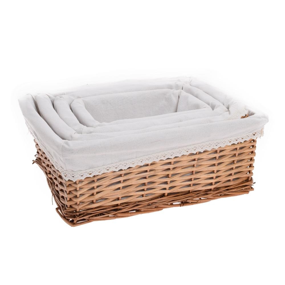 Dekorace Prút. košík s/4 obdĺžnik sv.hnedý biela látka 40x30x16cm + 23x15x10cm + 34x24x14cm + 28x18x12cm