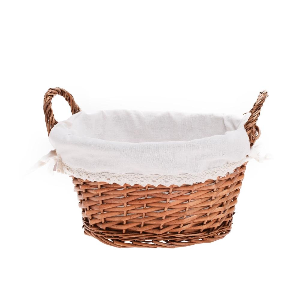 Prút. košík ovál hnedý s rúčkou biela látka 29x23x15cm