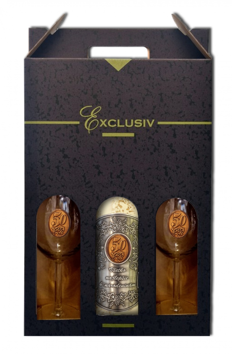 Darčekový set obsahuje Gold Cuvee 23 karátové zlaté lupene - víno s 23 karátovým zlatom s kovovou etiketou s venovaním všetko najlepšie k narodeninám s vekom 50 rokov + 2 ks pohár na víno s brondzovou pečaťou, darčekové balenie exlusive.Možnosť objednať ružové Svätovavrinecké, alebo červené Frankovka modrá.Obsah alkoholu 11,5% objemu. Svätovavrinecké 11,5% objemu, Frankovka modrá 12% objemu.