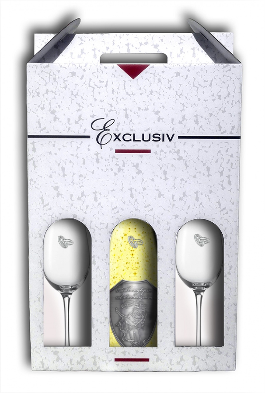 Darčekový set obsahuje akostné odrodové víno s kovovou etiketou s venovaním Všetko najlepšie mladomanželom + 2 ks pohár na víno, darčekové balenie exlusive.Flaša: 0,75 L Akostné odrodové víno Irsai Oliver - obsah alkoholu 11,5 objemu.