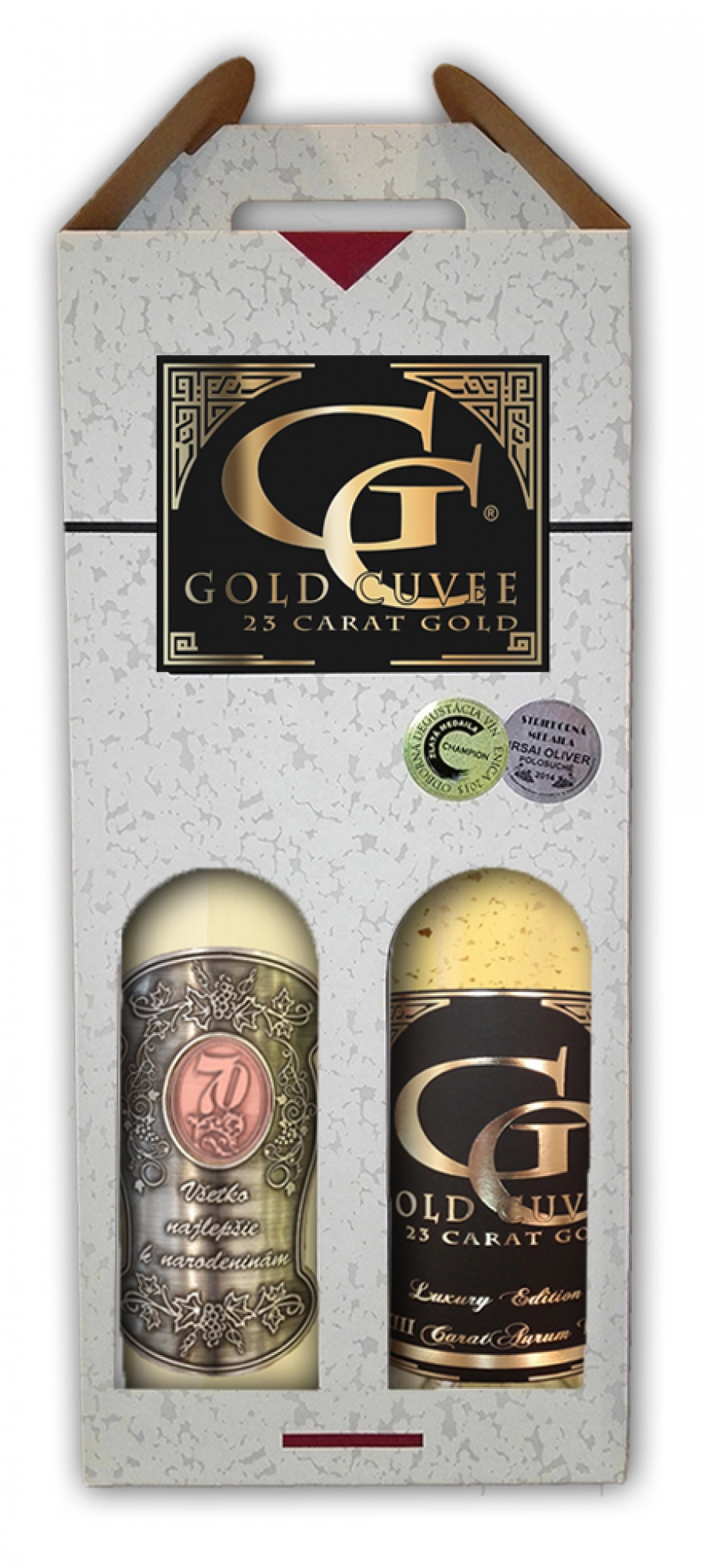 Darčekový set obsahuje Gold Cuvee 23 karátové zlaté lupene - víno s 23 karátovým zlatom + víno s kovovou etiketou s venovaním všetko najlepšie k narodeninám s vekom oslávenca 70 rokov.