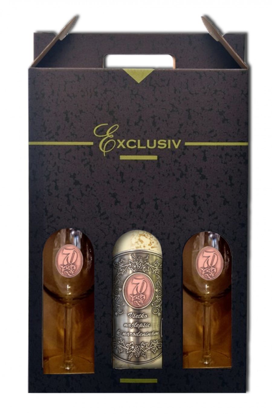 Darčekový set obsahuje Gold Cuvee 23 karátové zlaté lupene - víno s 23 karátovým zlatom s kovovou etiketou s venovaním všetko najlepšie k narodeninám s vekom 70 rokov + 2 ks pohár na víno s brondzovou pečaťou, darčekové balenie exlusive.