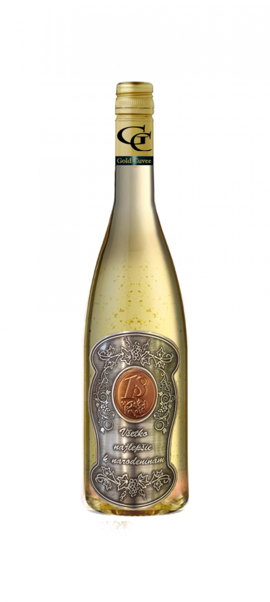Zloženie: 97% Irsai Oliver - akostné odrodové víno biele polosuché, 23 karátové zlaté lupene - likér 3 gold.