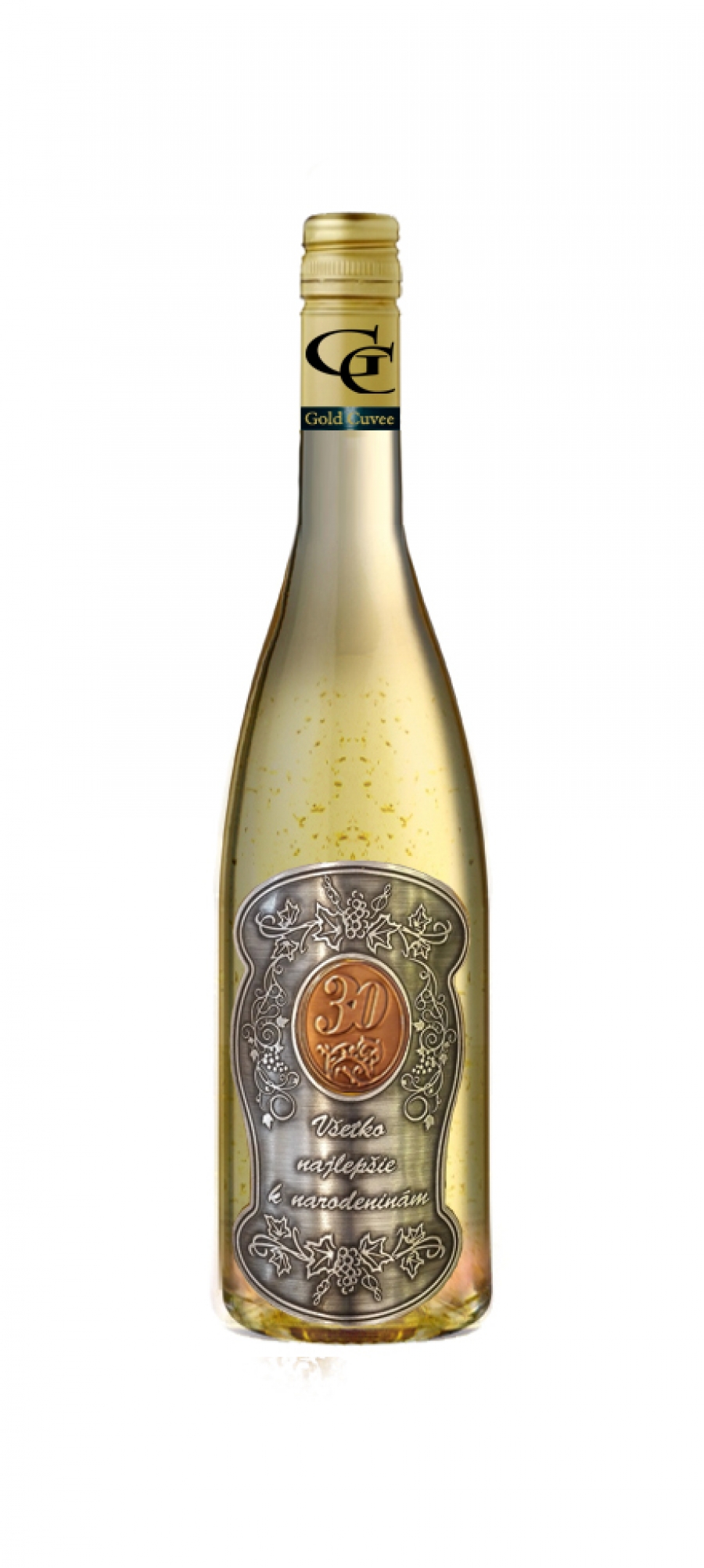 Zloženie: 97% Irsai Oliver - akostné odrodové víno biele polosuché, 23 karátové zlaté lupene - likér 3 gold.