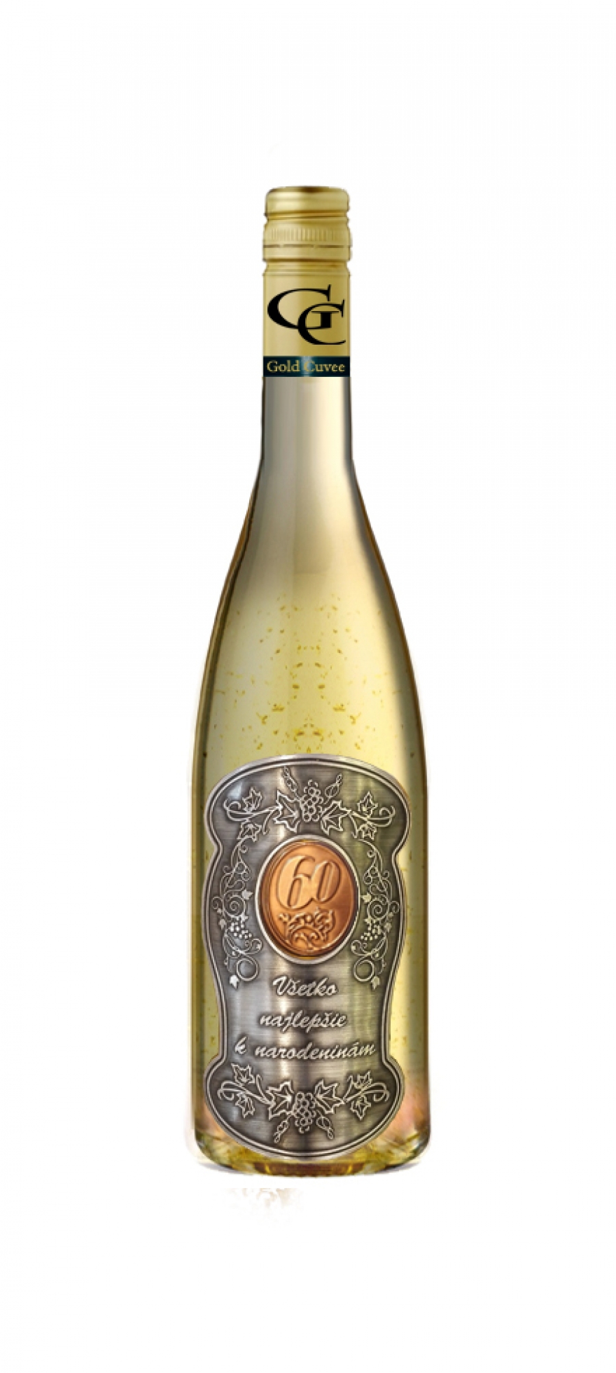 Etiketa: Kov cín - s venovaním: Všetko najlepšie k narodeninám s vekom oslávenca razenej na bronzovej etikete, 60 rokov.