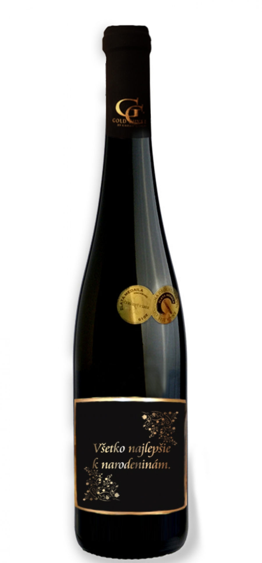 Darčekové víno obsahuje metalickú etiketu s vysokým rozlíšením pozlátenú.