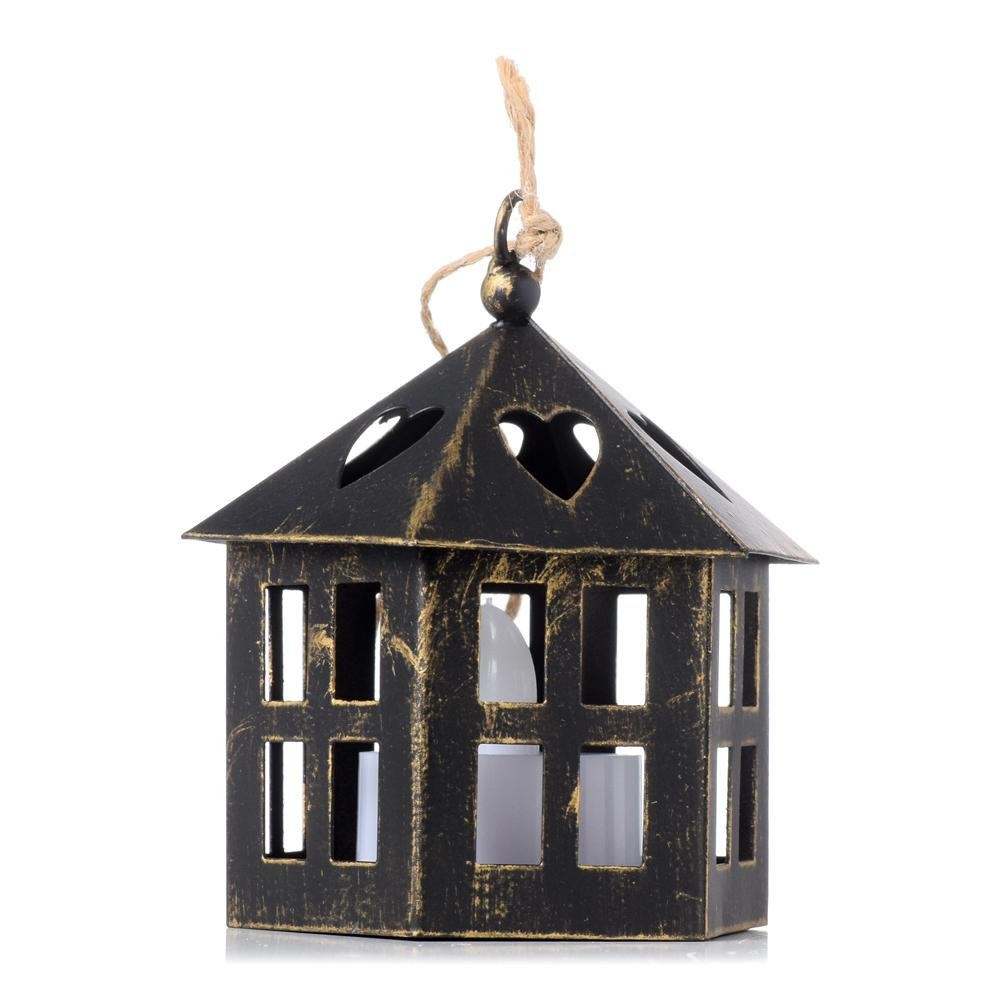 Elegantný lampáš v tvare domčeka s tmavým kovovým povrchom a jemnou patinou. Srdiečkové výrezy a okienka umožňujú krásne rozptýlenie svetla, čím vytvárajú útulnú a romantickú atmosféru. Ideálny ako dekorácia do interiéru, na terasu alebo záhradu.