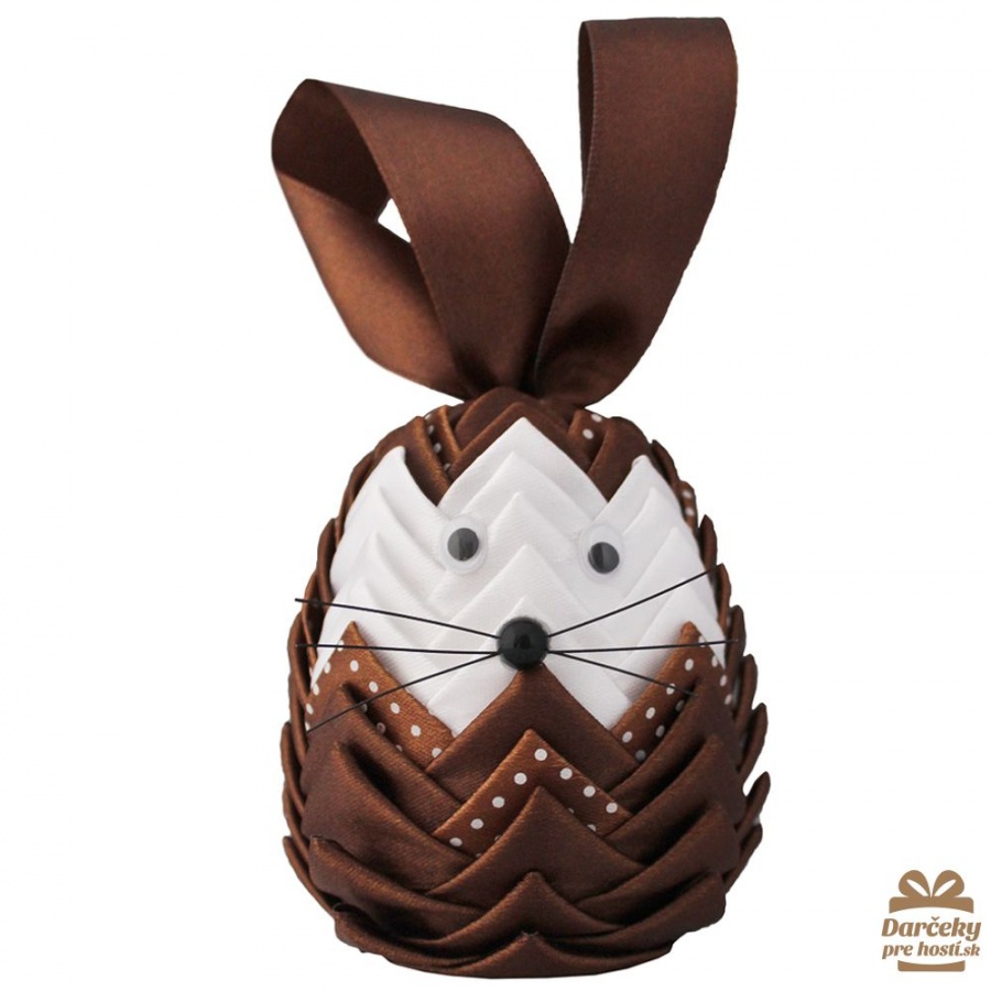 Tento zajačik je vytvorený zo saténových stúh, polystyrénového vajíčka a ostatných dekorácií na dozdobenie (očká, noštek a fúziky).Je vytvorený pomocou techniky falošný patchwork, kde sa trojuholníčky stuhy prichytávajú na polystyrén pomocou špendlík