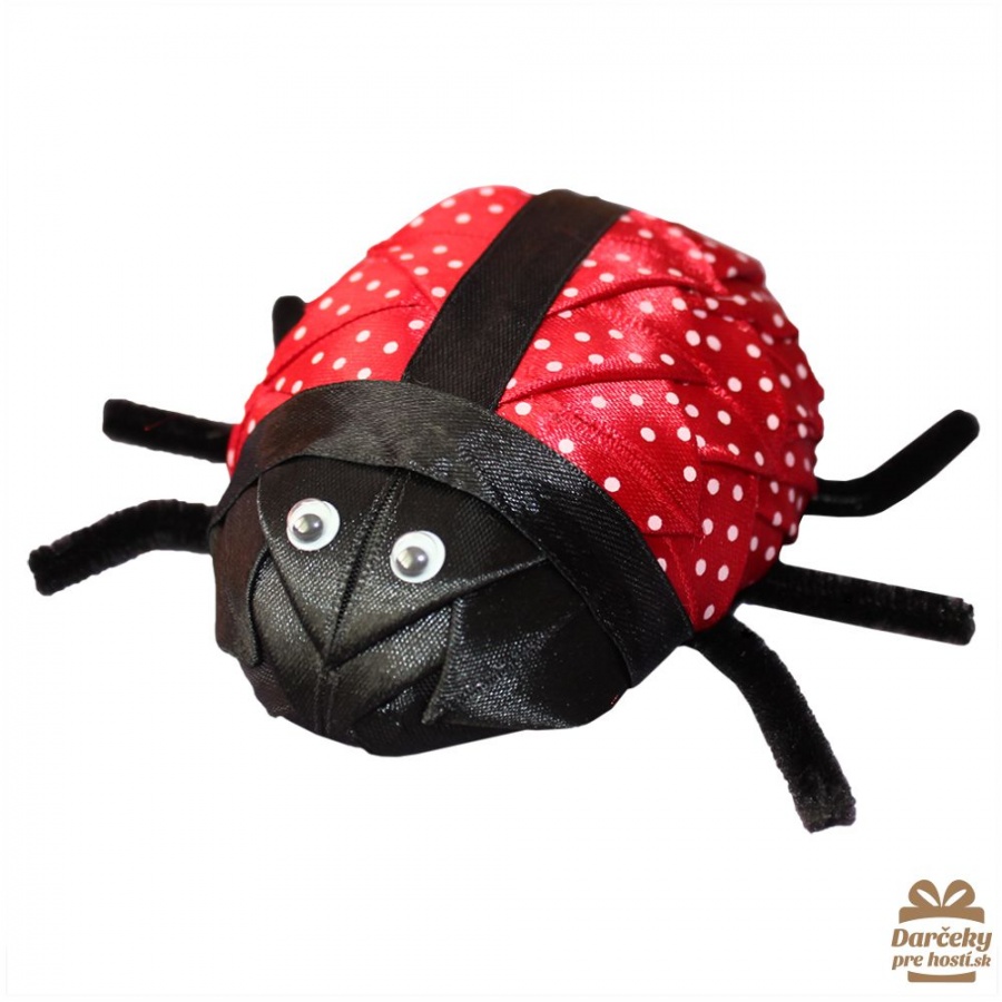 Lienka je vytvorená zo saténových stúh, ktoré sú pripevnené ku polovici polystyrénového vajíčka špendlíkmi. Ku lienke sú pripevnené chlapé drôtiky ako nožičky.Upozornenie: Jedná sa o bytovú dekoráciu a preto nie je vhodný pre deti do 3 rokov! farba: