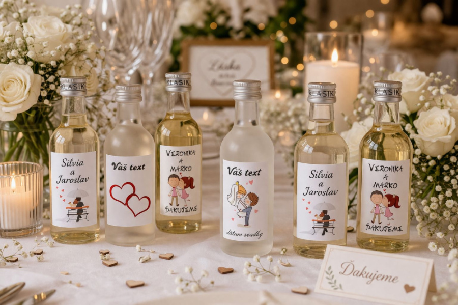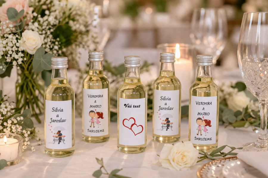 Svadobná mini fľaštička s alkoholom - Potešte svadobných hostí netradičným darčekom, venujte im ako malé poďakovanie mini fľaštičku s grafickým prevedením presne podľa Vašej predstavy. Na výber sú viaceré druhy alkoholu.