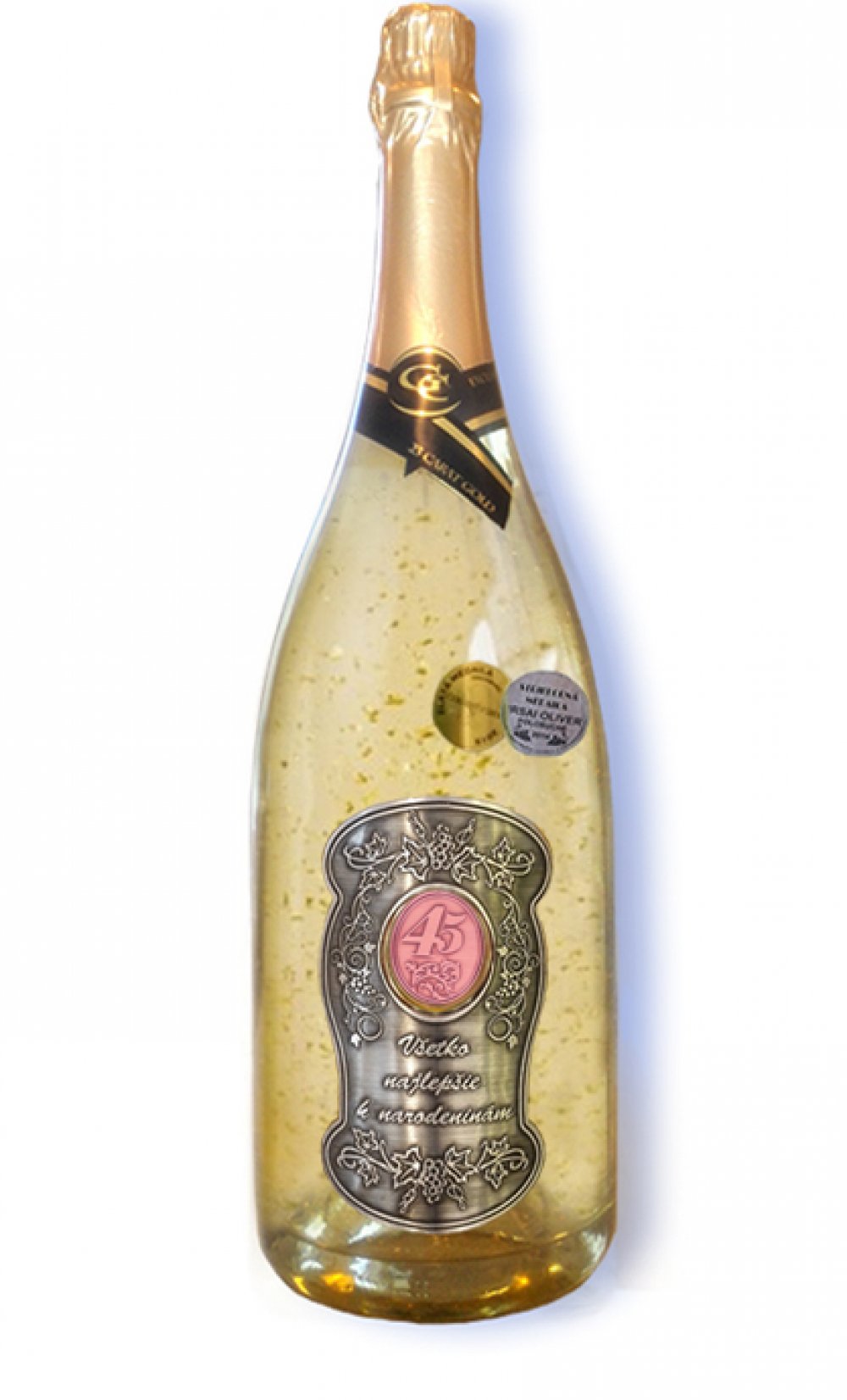 Gold Cuvee Biele šumivé víno s 23 karátovými lupeňmi zlata a želaním Všetko najlepšie k narodeninám ... Etiketa: (Kov) Cín, mosadz, ražba štočkom, lakovaná....