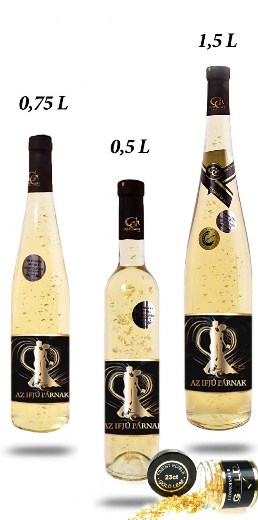 Ajándék palack - Arany habzóbor Ifjú párnak fémes Címke: (fém), dombornyomás klisével, lakkozott. Irsai Olivér 23 karátos arannyal Származási ország:...